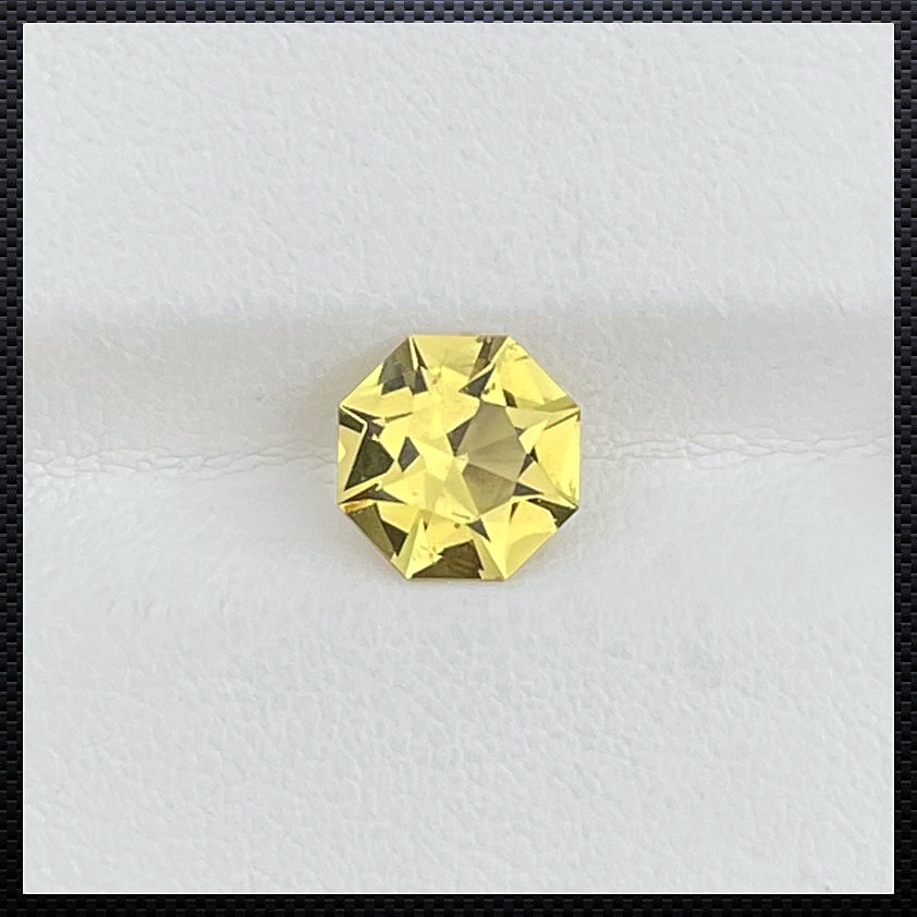 Notas: A partir del cristal en bruto que se muestra en las fotos, he tallado este berilo amarillo natural procedente de Brasil. Presenta un color luminoso y una pureza excepcional (IF). La talla “Whirling Octagon” es un diseño de Loren Brown y ha sido elegida para maximizar el brillo y la elegancia de la gema.