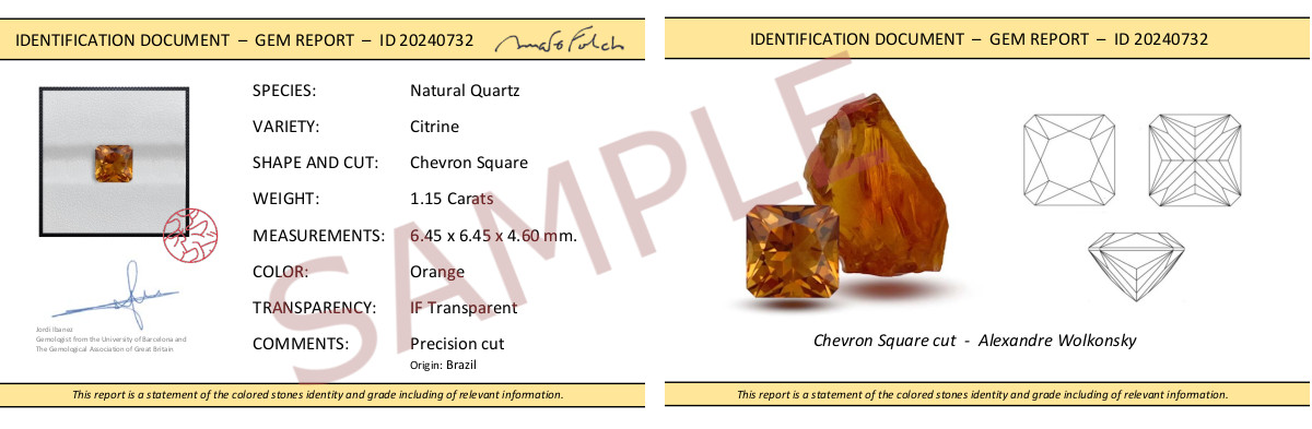Gemological certificate included: with a photo of the rough crystal and the cutting diagram.